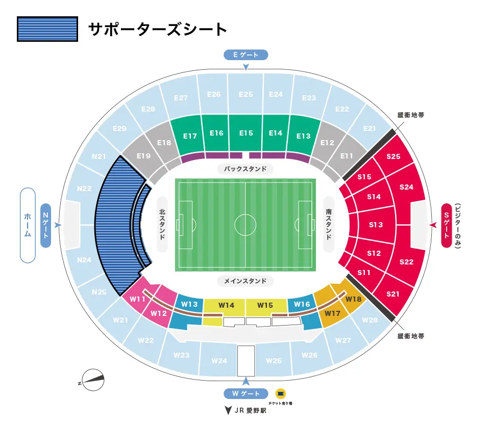 | Nゲート | バックJ指定席、バックA指定席、バックD指定席、サポーターズシート、2層目ホーム自由席 | |